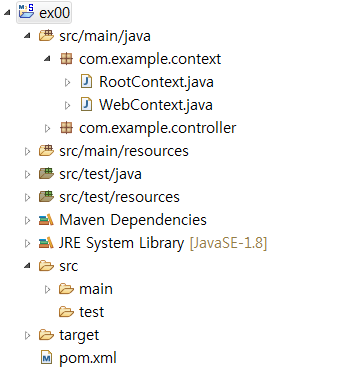 4. Java 설정파일을 만들기위해 com.example.context 패키지를 추가합니다. 추가된 패키지 내에 RootContext.java, WebContext.Java를 아래와 같은 내용으로 추가합니다.