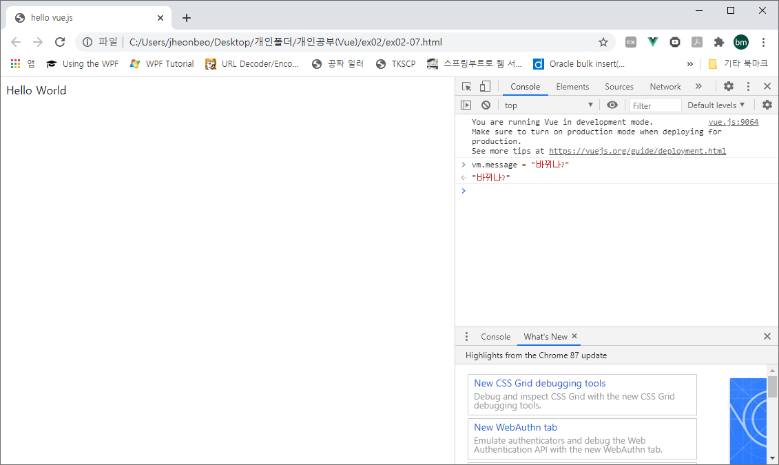 Vue 인스턴스 데이터를 변경하더라도 다시 랜더링을 수행하지 않는걸 확인할 수 있습니다.