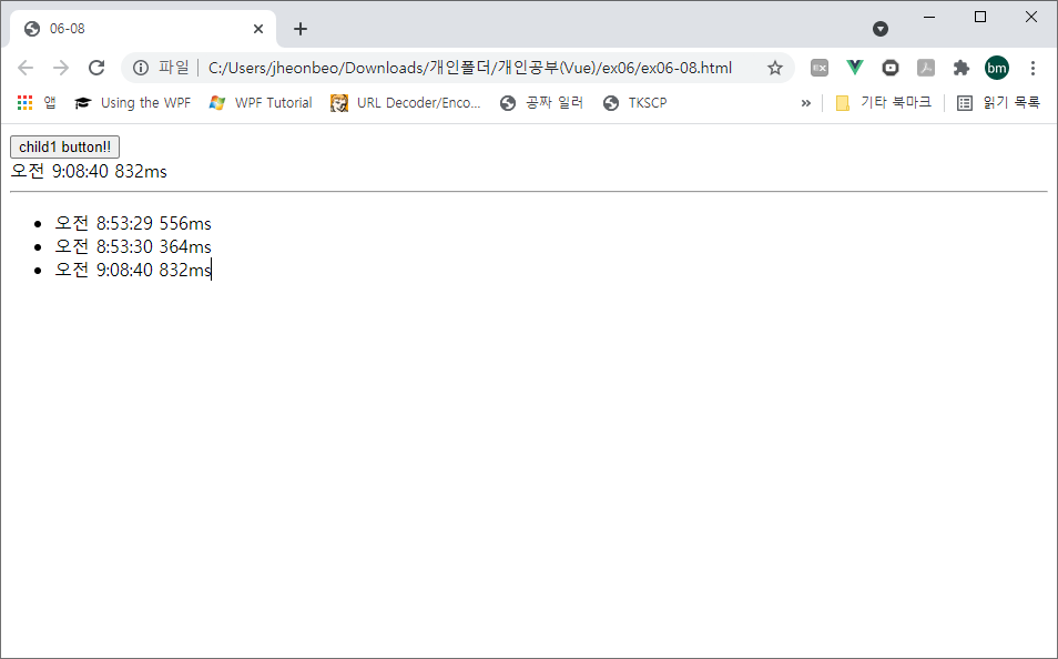 - emit 메서드를 이용해 timeclick 이벤트를 발신합니다. 그러면 부모 컴포넌트에선 v-on 디렉티브를 이용해 timeclick 이벤트를 처리합니다. 필요한 매개변수는 emit 메서드로 함께 보내주도록 합니다.