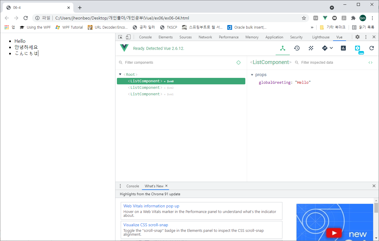위 예제는 list-component 컴포넌트를 작성하면서 globalGreeting이라는 이름의 속성(props)를 정의했습니다.